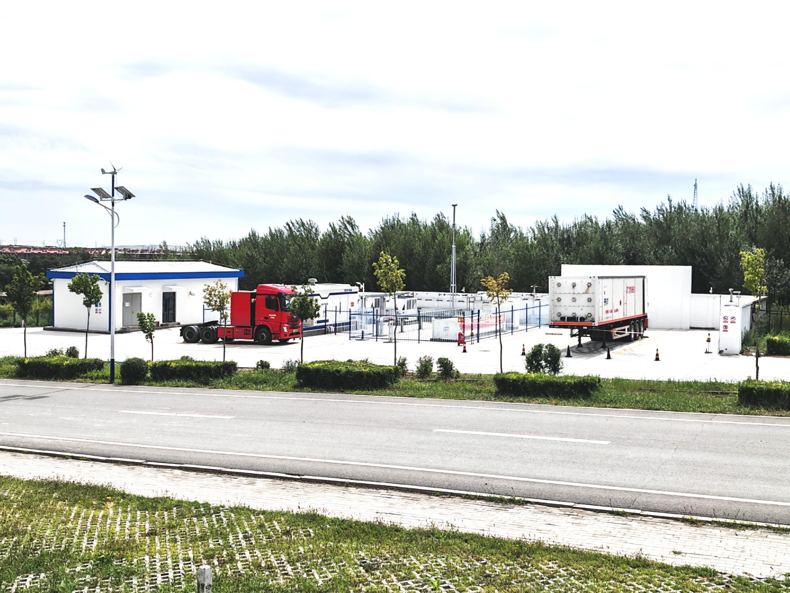 該項目為內蒙古包頭市首座氣態加氫示范站,由上海申能集團與包鋼集團合資公司包頭氫能綠電能源有限公司投資,華飛工程負責EPC總包。白云鄂博鐵礦加氫站項目落戶包頭市白云鄂博鐵礦區,這是一座三級加氫站,目前氫氣加注能力為500kg/d(設計氫氣加注能力為1000kg/d),包含一套加氫一體機、1臺6㎡儲氫瓶組以及配套冷水機組等附屬設備,建設兩個長管拖車停車位,一座艙式站房,滿足了礦區鐵礦運輸重卡、叉車及礦內職工班車等車用氫燃料要求。                                                                                          圖 / 項目現場
